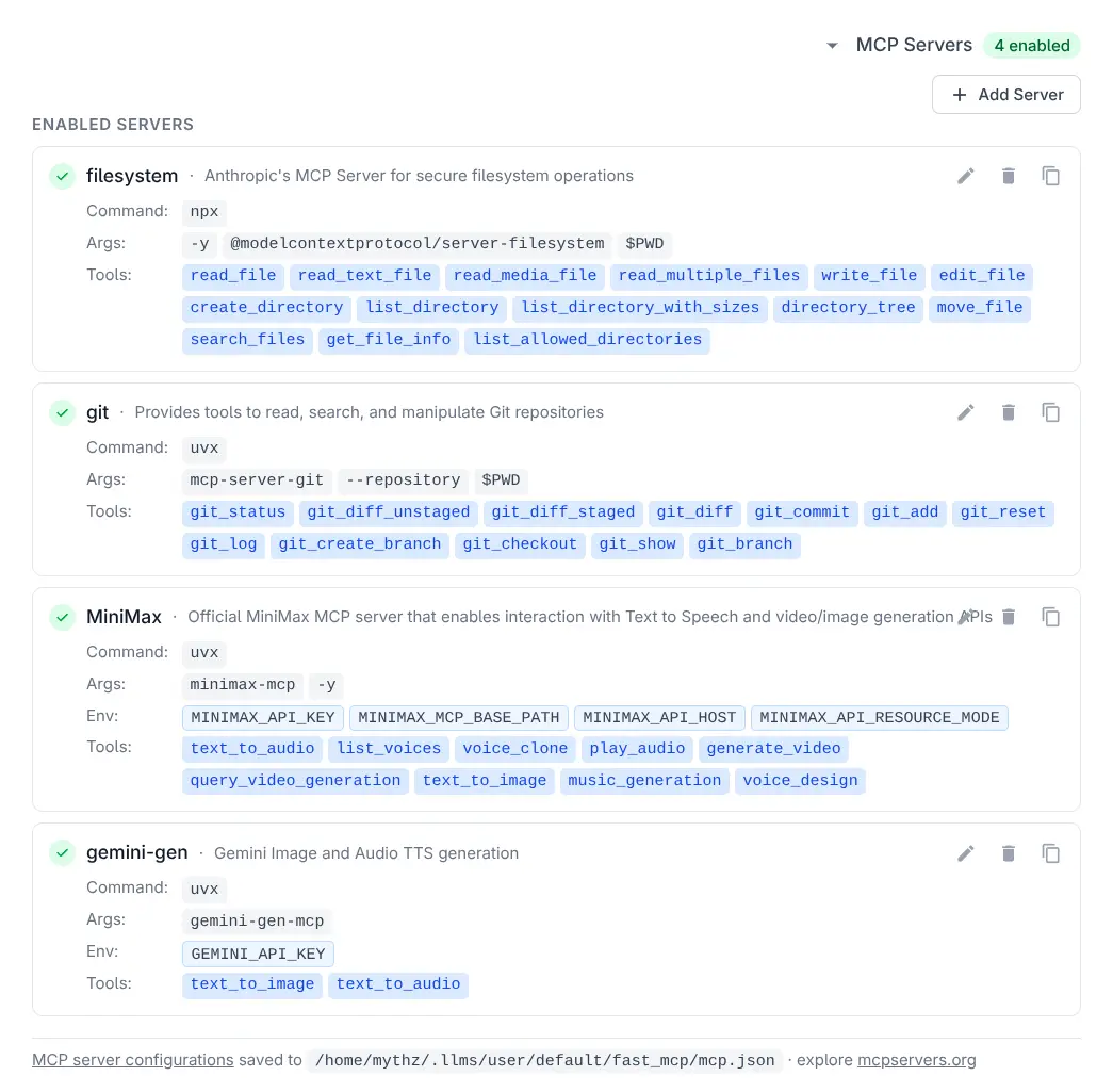 ~/.llms/user/default/fast_mcp/mcp.json - Default Config: The ui/mcp.json file bundled with the extension.