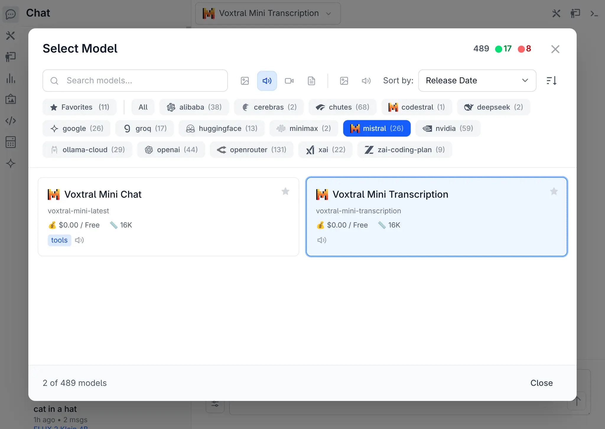 Added support for Mistral's Voxtral audio transcription models - use the audio input filter in the model selector to find them.